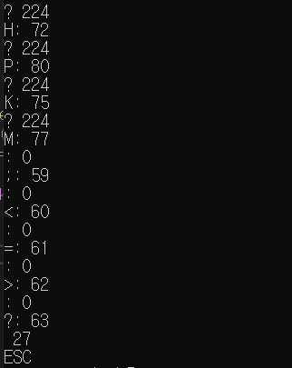 방향키를 비롯한 몇몇 입력들은 1바이트로 처리되는 아스키코드와 다르게 확장 아스키 코드를 사용하기 때문에 저렇게 두번의 변환을 통하여 표현됩니다.